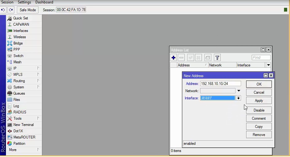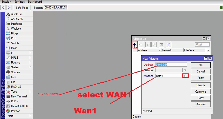 add address=192.168.10.10/24 interface=WAN1 network=192.168.10.0