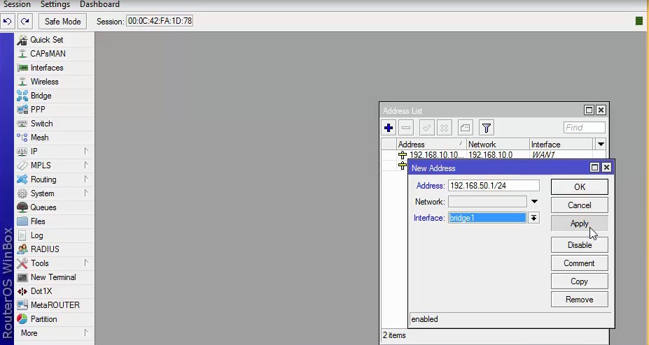 add address=192.168.50.1/24 interface=bridge1 network=192.168.50.0